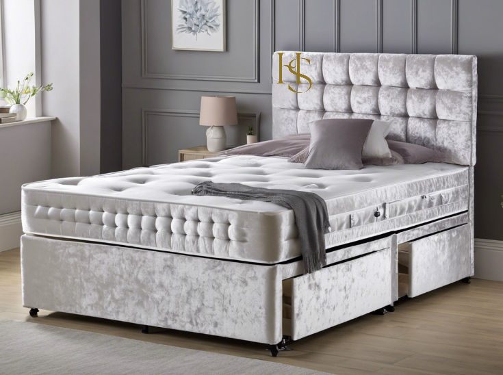 Indulge in the luxurious comfort and sophisticated style of our King Size Divan Bed in Crushed Silver. The plush, crushed silver fabric exudes elegance, while the coordinating headboard adds a regal touch to your bedroom decor.